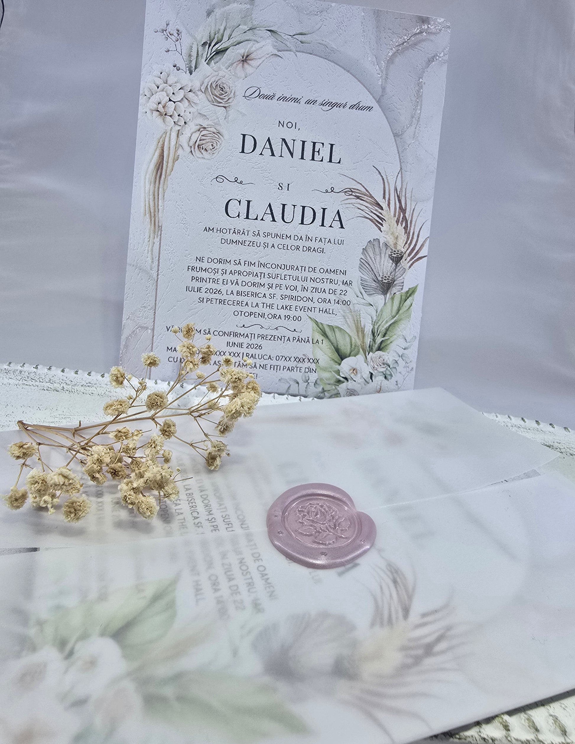 Adaugă o notă de rafinament nunții tale cu această invitație de nuntă florală elegantă, realizată cu atenție la detalii. Designul romantic cu motive florale delicate este perfect pentru o nuntă clasică, boho sau în aer liber. Poate fi personalizată cu numele mirilor, data și locul evenimentului. Ideală pentru cuplurile care își doresc un început de poveste de neuitat.